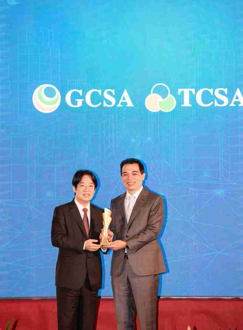 达全方位永续表现获全球永续奖及台湾永续奖肯定,,,由副总统赖清德颁奖 (左),,,,口袋牛店总经理柯富仁 (右) 代表领奖
